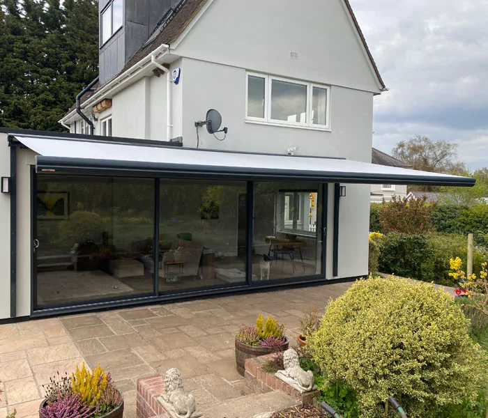 A large Weinor Semina awning with a width of 7m and a projection of 3.5m. Due to the nature of the construction of the wall (breeze block) and the fact that we need a central bracket due to the width of the awning, we designed bespoke goal post bracketing bracketing with matching RAL colour to the awning.